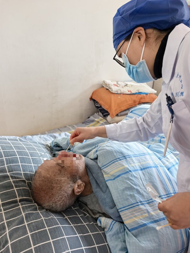 细节关怀:护理结束后,小王和小仇又帮老人测了血压,对家属进行了相关的健康宣教,教他们如何判断胃管是否通畅,并留下24小时咨询电话。临走时,仇护士还帮老人整理好被子,笑着说:“有需要随时叫我。”