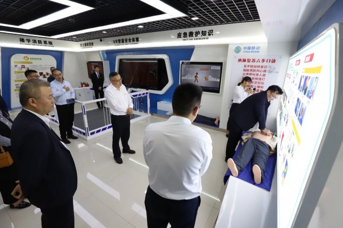 活动现场,在徐州移动党委书记、总经理徐星宇的带领下,市传染病医院一行先后参观了徐州移动党员教育实境课堂、5G体验厅、安全体验厅,了解红色通信发展史、徐州移动公司党建发展思路、5G信息化应用等相关情况。
