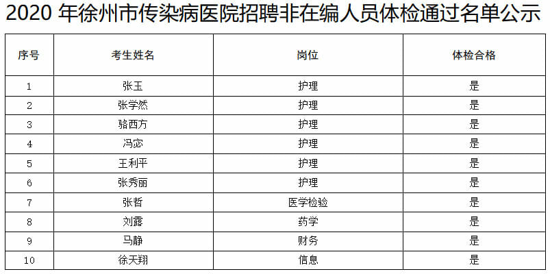 根据《徐州市传染病医院2020年公开招聘非在编工作人员公告》要求,现将体检合格人员及参加政审考察等相关事宜通知如下:
