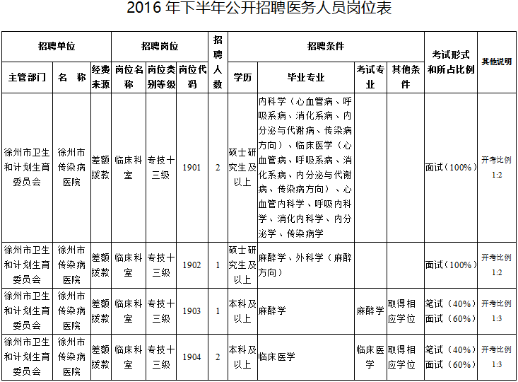 徐州市传染病医院2016年下半年参加徐州市人社局统一招聘,请有意者及时与医院政工科联系,联系电话0516-83668706,并参加现场报名。具体请登录徐州人力资源和社会保障网公示公告中查询(http://www.jsxz.lss.gov.cn/news.do?newsid=43116)。