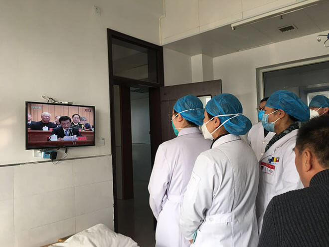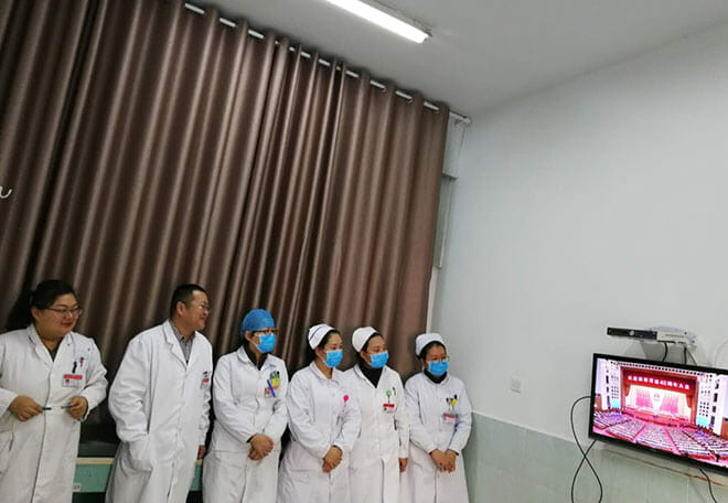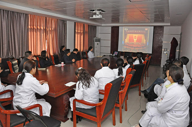 改革开放,辉煌40年。2018年12月18日上午10时,庆祝改革开放40周年大会在人民大会堂隆重举行。中共中央总书记、国家主席、中央军委主席习近平同志出席大会并发表重要讲话。徐州市传染病医院院长、党委副书记张克球同志、党委书记李健同志、副院长王春颖同志、苏珂同志、姚均伟同志、郇业青同志及职能科室负责人等在行政办公楼三楼会议室集中收听收看庆祝改革开放40周年大会盛况。医院临床、医技等科室在本科室组织人员收看。
