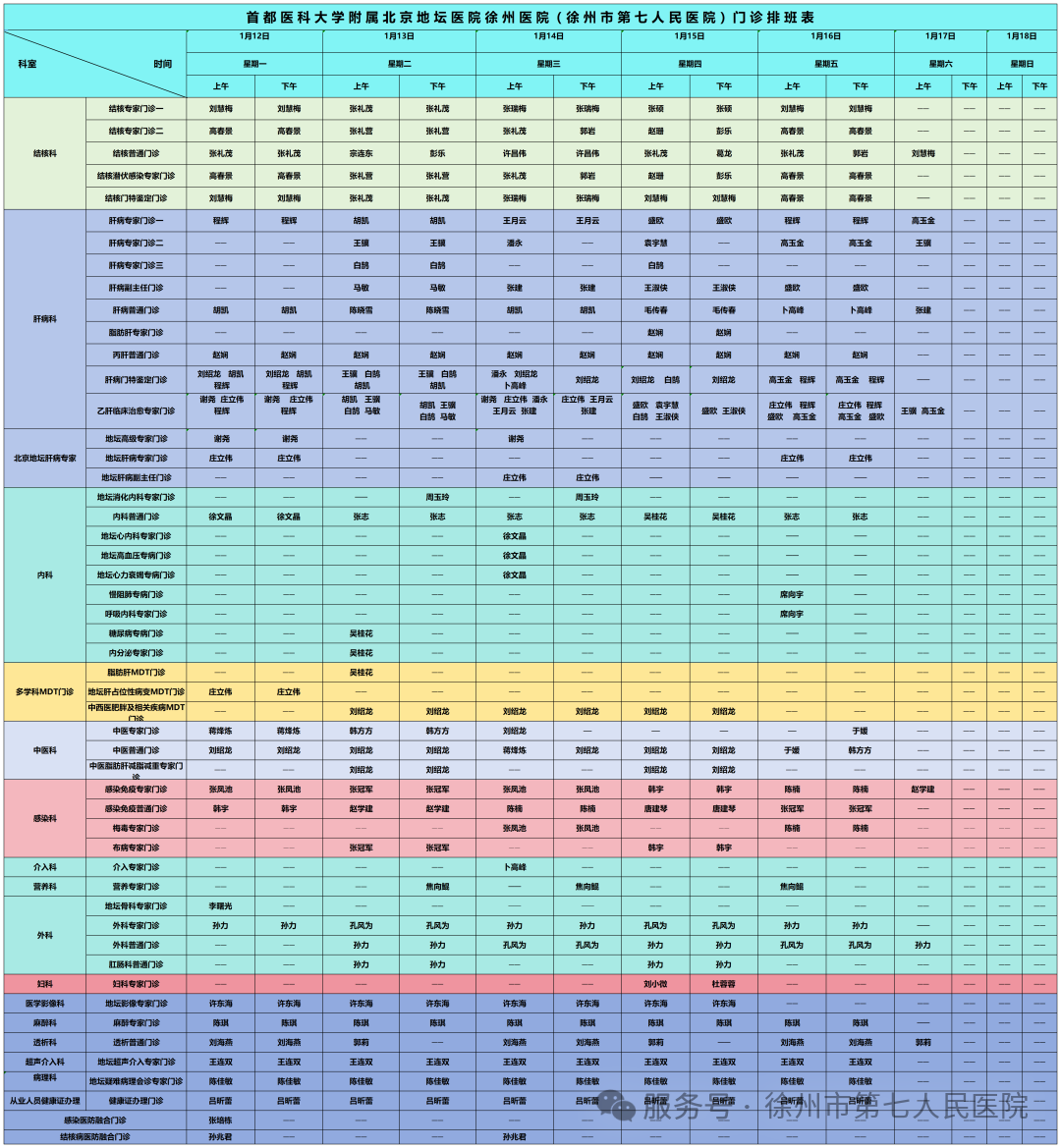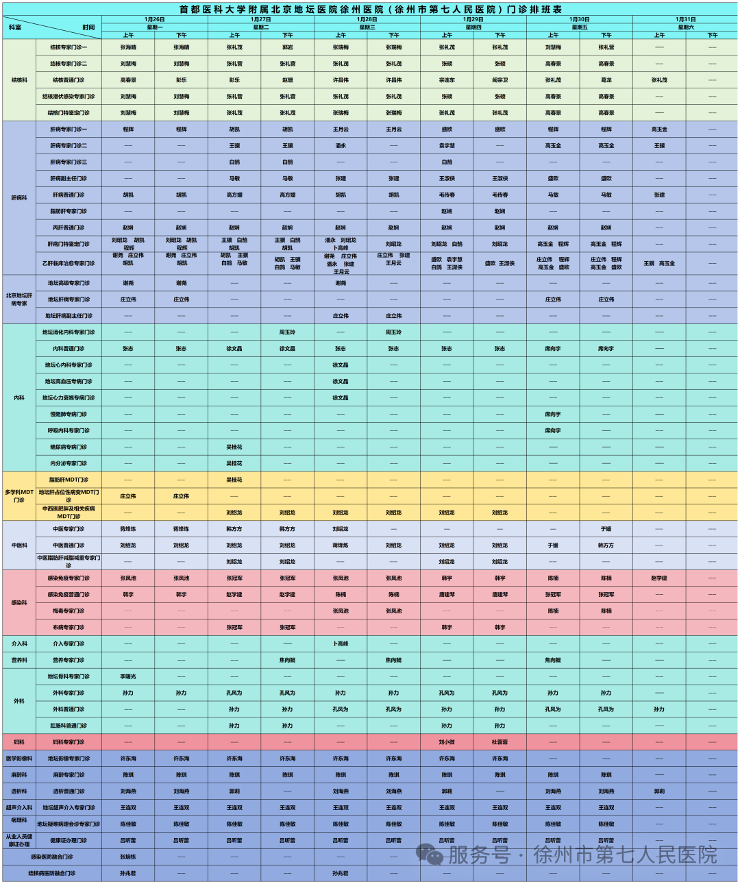 2026年1月1日-31日门诊排班