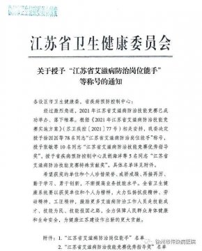 在江苏省卫生健康委举办的2021年江苏省艾滋病防治技能竞赛中,我院感染科韩宇医师代表徐州市参赛,获得团体比赛第一名。被江苏省卫生健康委授予"江苏省艾滋病防治岗位能手"称号...