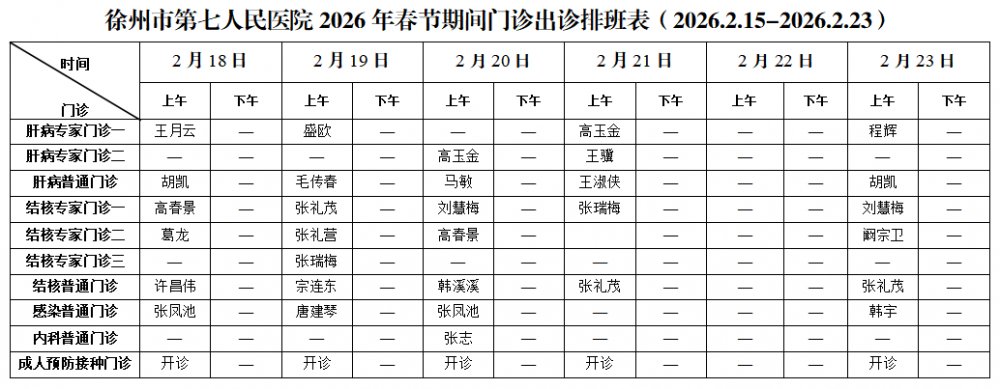根据国家相关规定,结合医院的具体情况,经医院研究决定,徐州市第七人民医院春节假期安排如下: