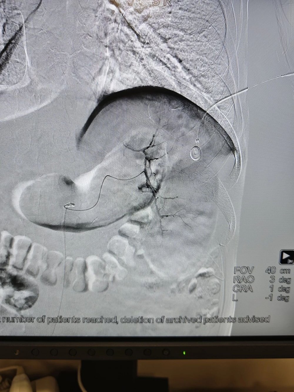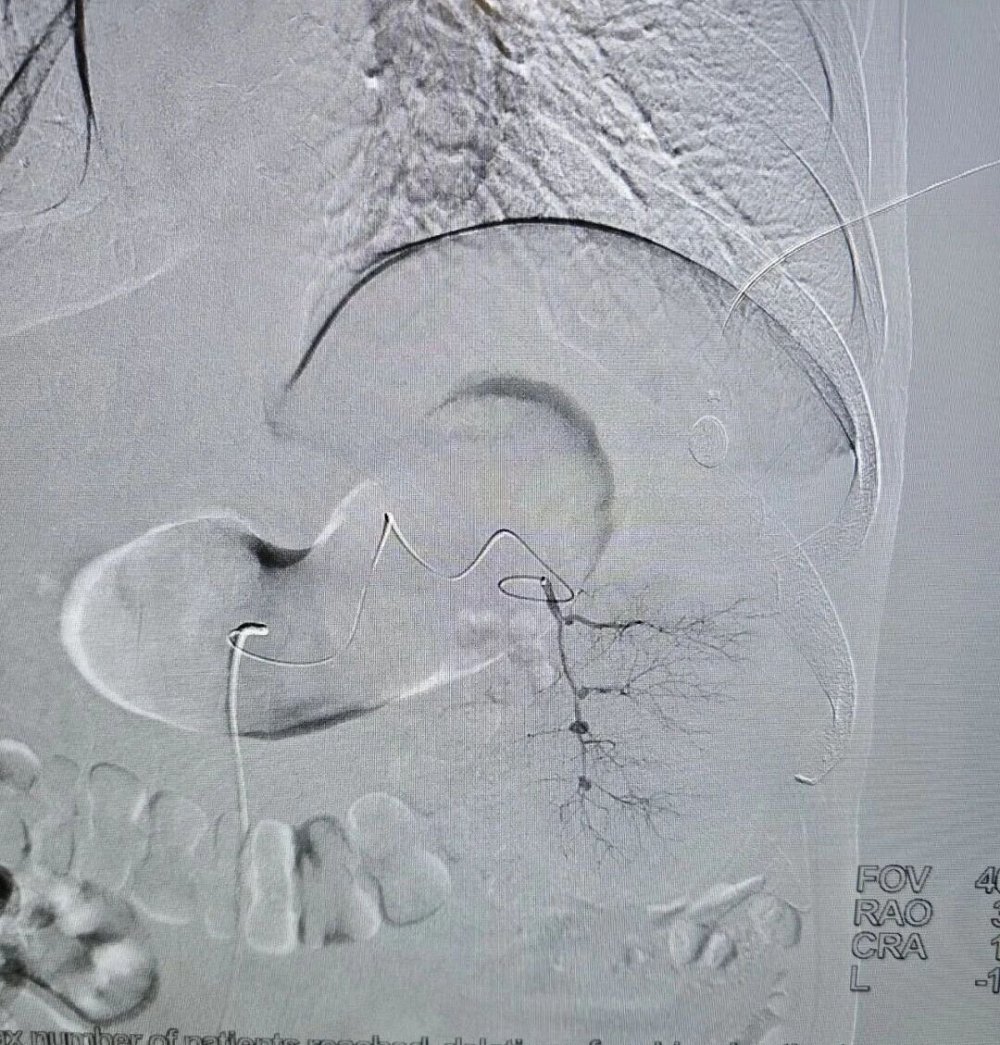 手术中,导管精准抵达脾动脉位置,清晰显示脾脏血管供血形态,为后续栓塞操作提供精准定位