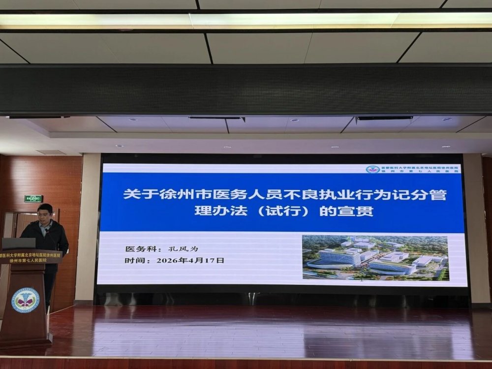 为深入贯彻落实国家及省市关于加强医务人员执业行为管理、强化医保基金监管、保障电子病历信息安全的系列部署要求,4月17日下午,北京地坛医院徐州医院(徐州七院)医务科组织召开专题培训会,会议由医务科科长王邺珩主持,全院临床、医技、护理、药学等岗位医务人员参会,会议围绕不良执业行为记分管理、医保政策、电子病历信息使用规范三大主题进行系统培训,进一步压实依法执业责任,筑牢医疗质量与患者安全防线。