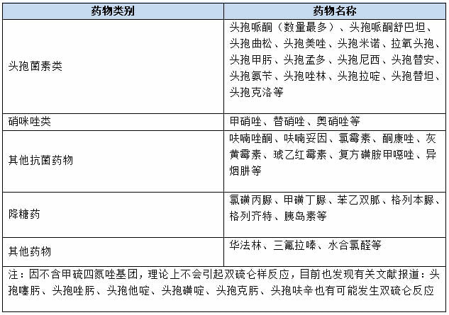 二、谨慎以任何形式接触乙醇:在使用易发生双硫仑反应的药物时,用乙醇擦皮肤(即使是少量)也可能在5~60min内出现双硫仑样反应,因此尽量避免用酒精消毒或者使用酒精擦洗降温。一些含酒精的药物制剂与上述表格中药物同用时也应慎重。
