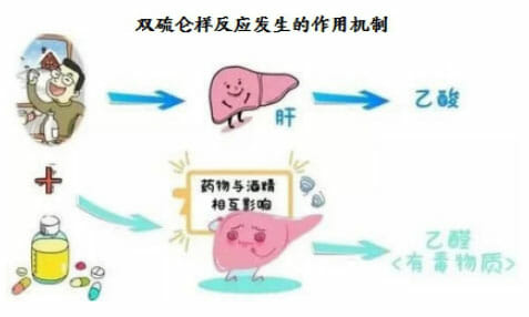 双硫仑样反应,又称戒酒硫样反应,是由于服用某些药物后饮用含有酒精的饮品(或接触酒精)导致的体内"乙醛蓄积"的中毒反应。其作用机制在于药物与酒精作用时,肝脏中的乙醛脱氢酶出现不可逆的抑制作用,使乙醇在体内氧化为乙醛后,不能再继续分解氧化,导致体内乙醛蓄积出现双硫仑样反应。