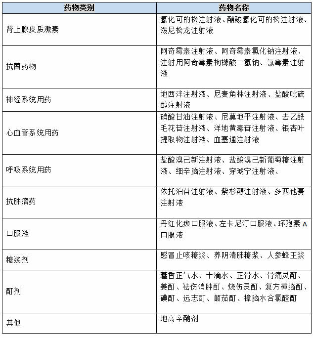 主要有激素(如地塞米松)、水溶性维生素(如维生素C、维生素B6)、纳洛酮等。