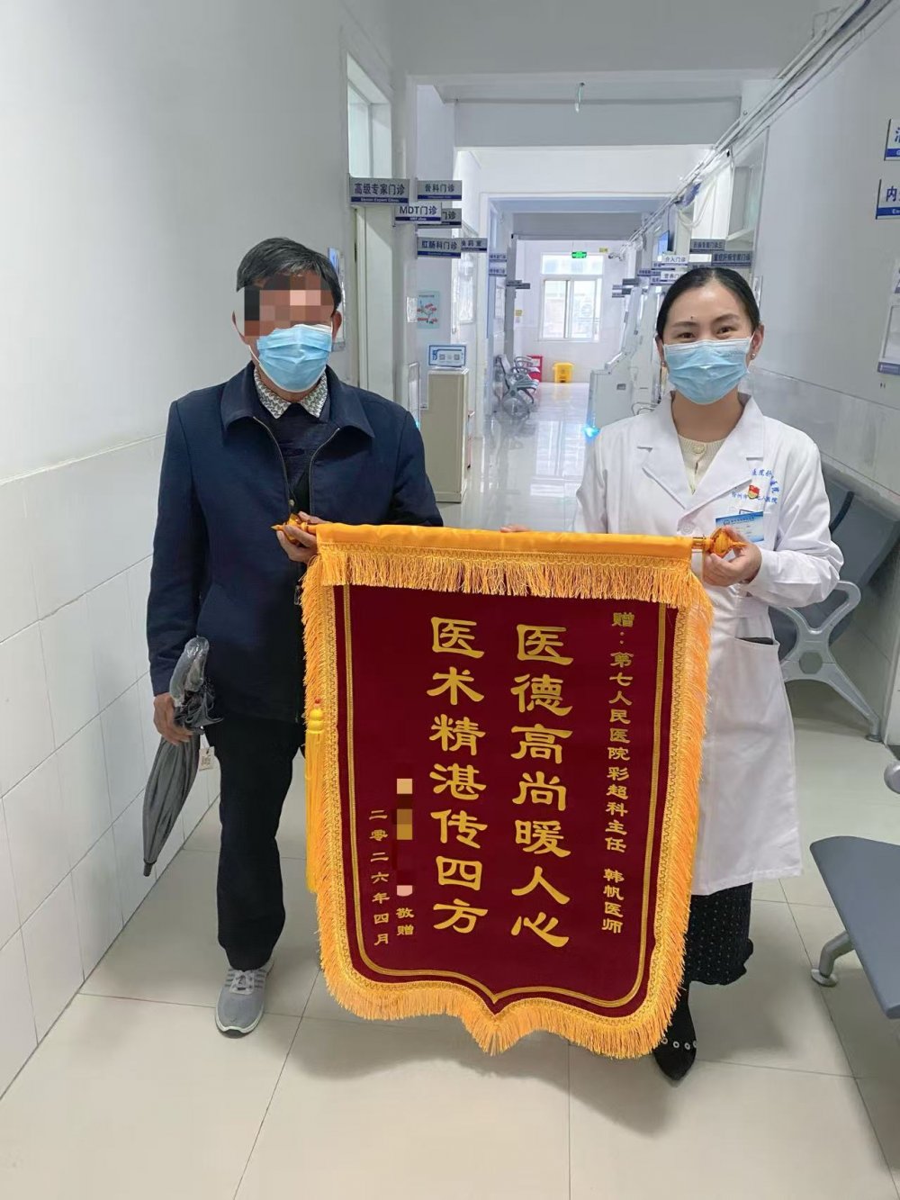 本以为只是一次寻常的复诊,没想到当天下午,老人取完化验单后,又冒着雨折返回科室。此时,韩帆正在超声介入诊室内进行着一台穿刺手术。当手术结束,护士匆匆走进来告诉她:“有位大爷来给您送锦旗了,一直坐在门口等着呢。” 韩帆这才急忙走出去。只见老人手捧用塑料袋包起来的锦旗,小心翼翼地打开锦旗,此时,他的衣服上还带着雨水的痕迹,但锦旗却是干干净净。