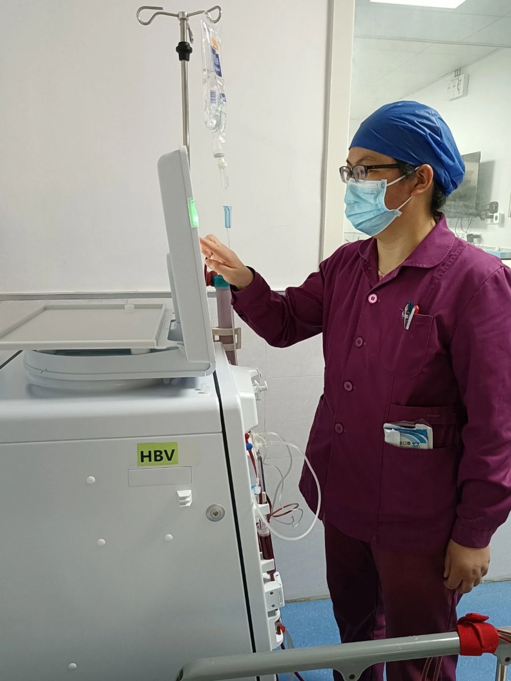 在透析室的时钟上,每一个刻度都承载着生命的重量。当夕阳的余晖透过玻璃窗洒在透析机的屏幕上,护士耿海侠的身影依然伫立在病床旁。她的手轻柔地按揉着患者因肌肉痉挛而紧绷的小腿,额角的汗珠在灯光下微微发亮,仿佛夜空中最执着的星子。这是透析室最寻常的一幕,却也是最动人的篇章。