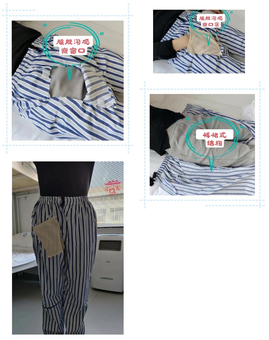 原发性肝癌TACE介入术后,患者穿刺部位需要特殊护理,传统病员裤穿脱时往往需要大幅度抬腿、翻身,不仅增加患者痛苦,还可能导致穿刺部位出血、血肿、移位,增加感染风险,使患者产生焦虑、抗拒心理,影响康复进程。北京地坛医院徐州医院(徐州七院)肝病三科护理团队在日常护理中敏锐捕捉到这一问题,决心对病员裤进行改良,为患者排忧解难。