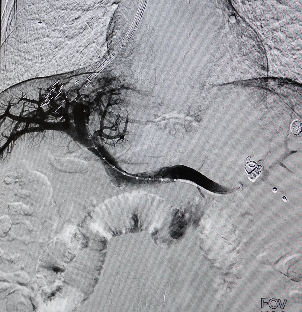 5月15日,手术按计划进行,在卜高峰及其团队的配合下,张明主任首先经颈静脉穿刺,引入导管至肝静脉,随后在DSA影像引导下精准穿刺肝内门静脉分支,建立肝静脉-门静脉通路。导丝通过后,球囊扩张分流道,并成功植入覆膜支架,用一根导丝,在患者肝脏内架起了一座生命“立交桥”,整个手术历时不到1小时。术中患者处于清醒状态,无明显不适,术后患者门静脉压力显著下降,生命体征平稳。