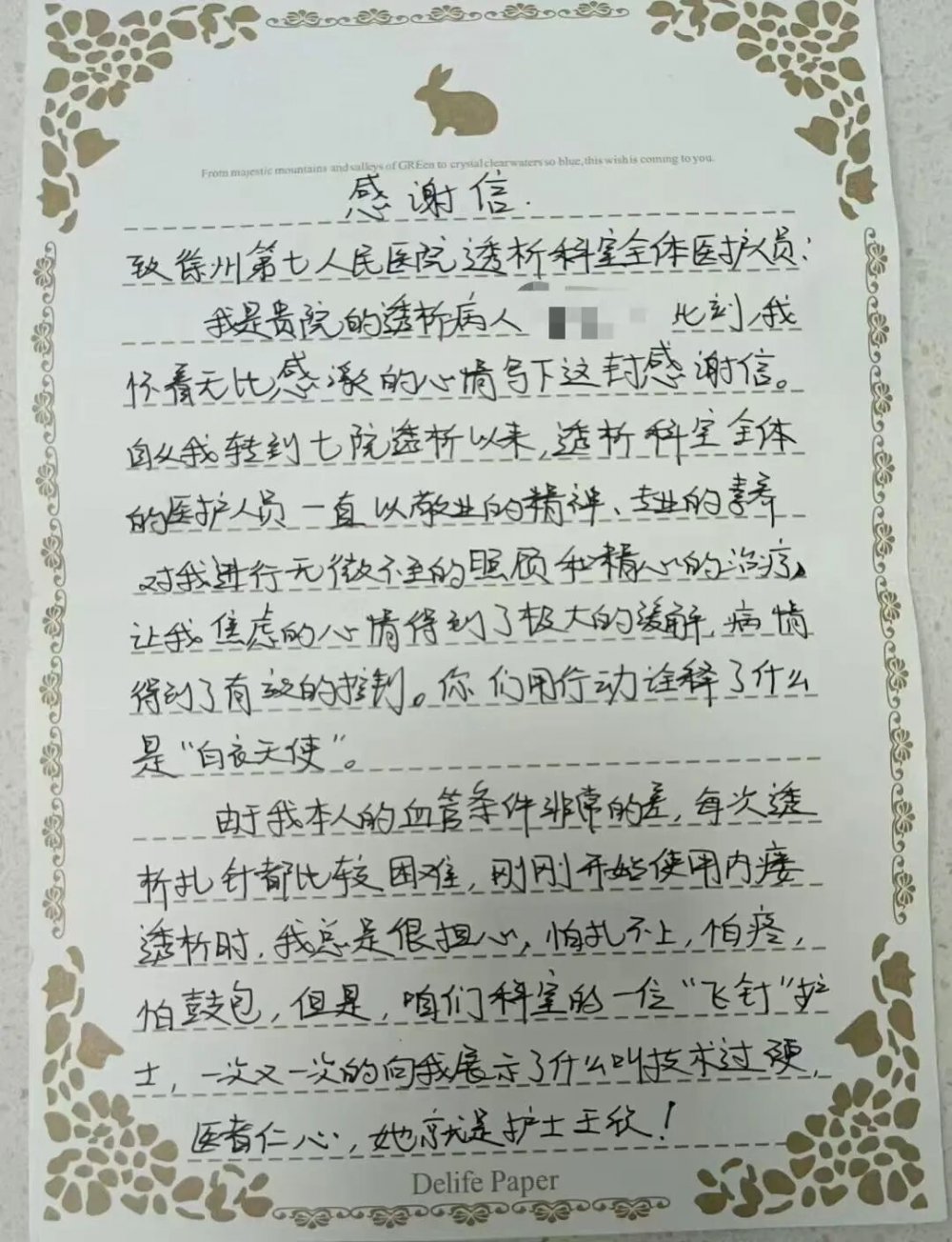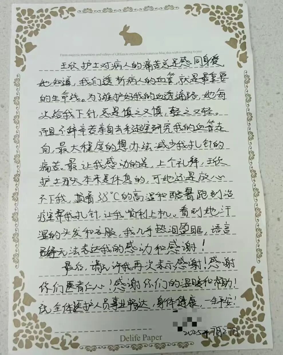 “感谢你们医者仁心!感谢你们的温暖和帮助!”这是一封来自透析患者张女士的感谢信,字迹工整,情感真挚。
