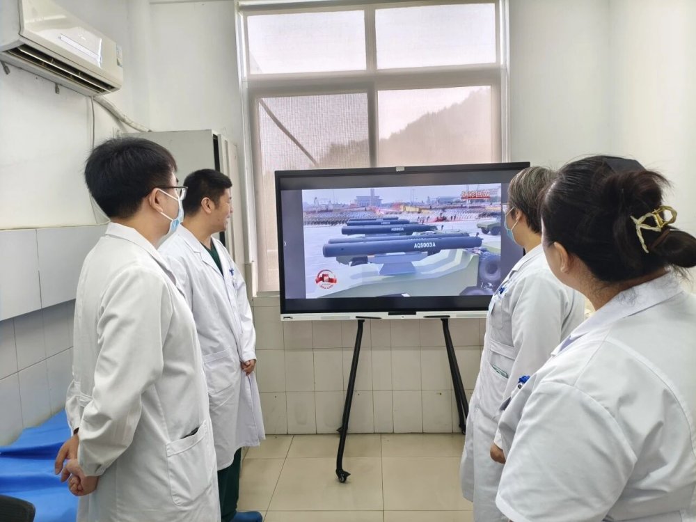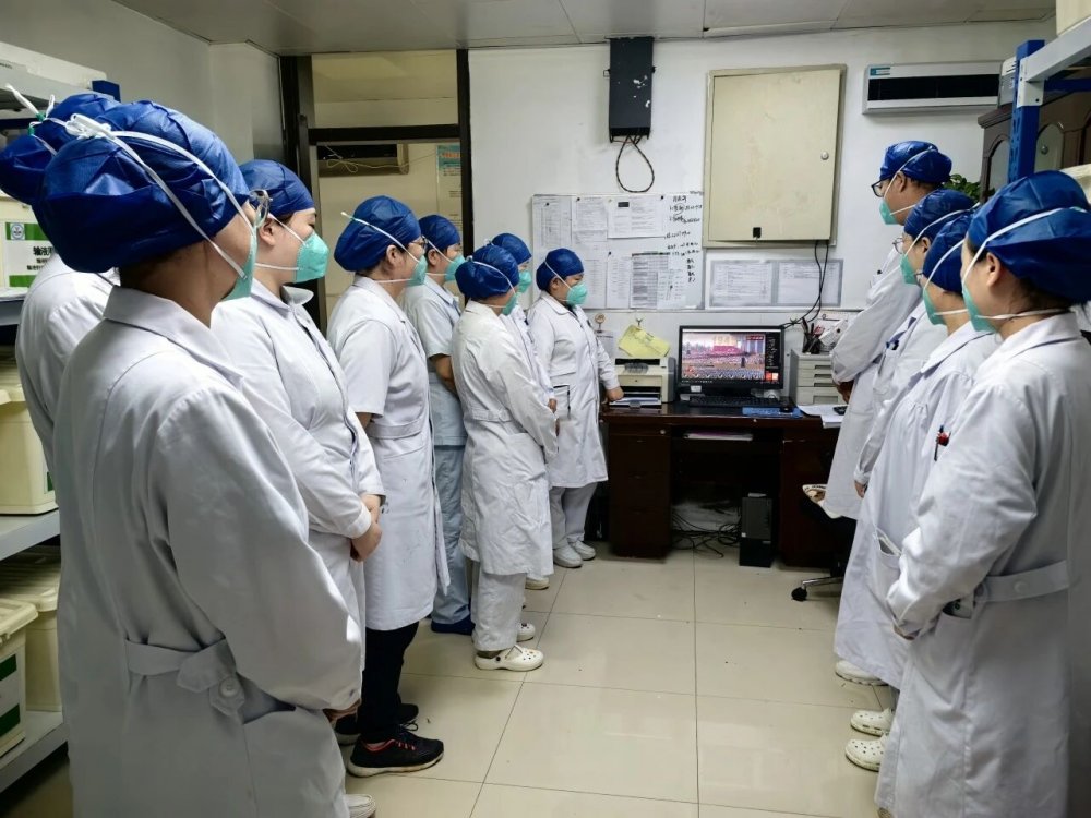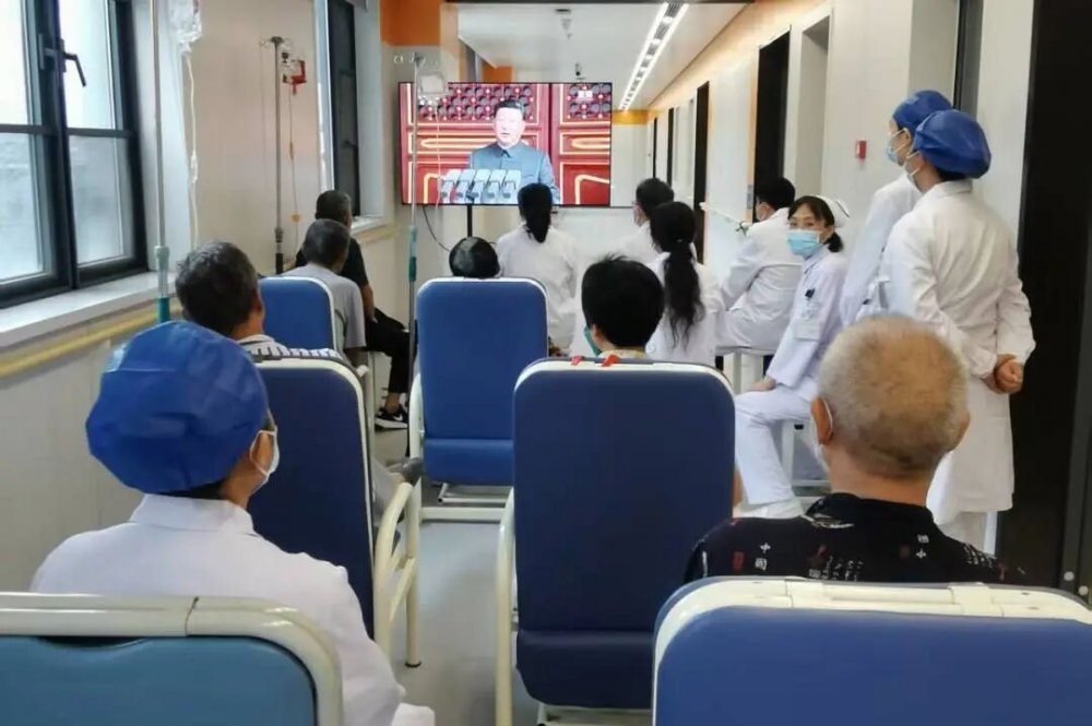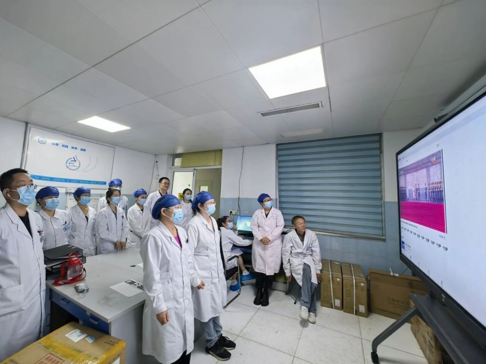 医院在行政楼三楼会议室设集中观看点,部分班子成员、职能科室中层干部、党员、群众齐聚,集中收看实况直播。
