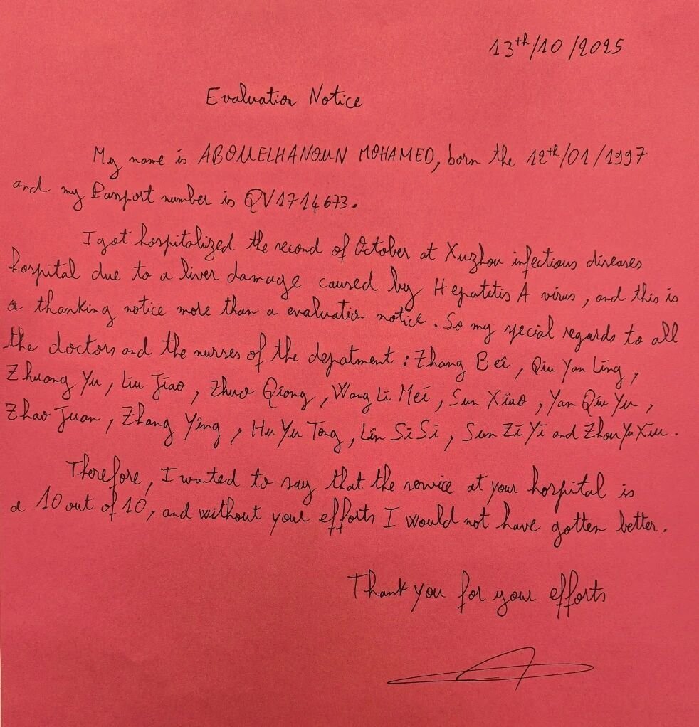 近日,北京地坛医院徐州医院(徐州七院)综合内科收到一封来自摩洛哥小伙儿的手写感谢信。