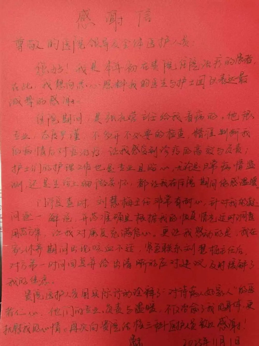 如今,刘先生已康复并停药,带着健康与信心重返正常生活,他一直非常感激结核三科医护人员的敬业与付出,于是抽出空来,特意跑一趟为科室人员送来了锦旗和感谢信。“医护人员用实际行动诠释了“对待病人如家人”的医者仁心,他们的专业、负责与温暖,不仅治愈了我的身体,更抚慰我的心情”。纸短情长,信中字里行间都洋溢着他对医护团队的诚挚谢意。