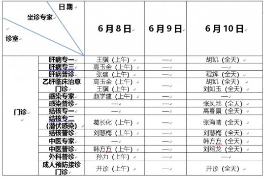 6月份门诊各科室排班表(2024年6月10日-6月30日)