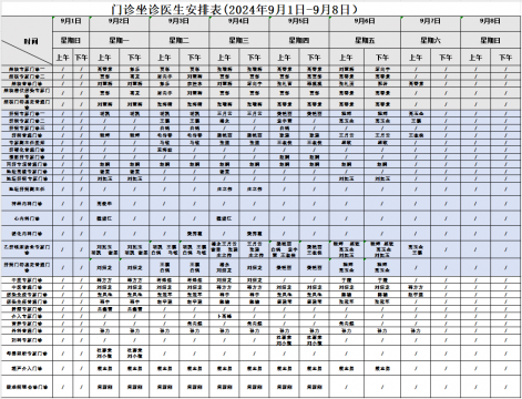6月份门诊各科室排班表(2024年6月1日-6月9日)