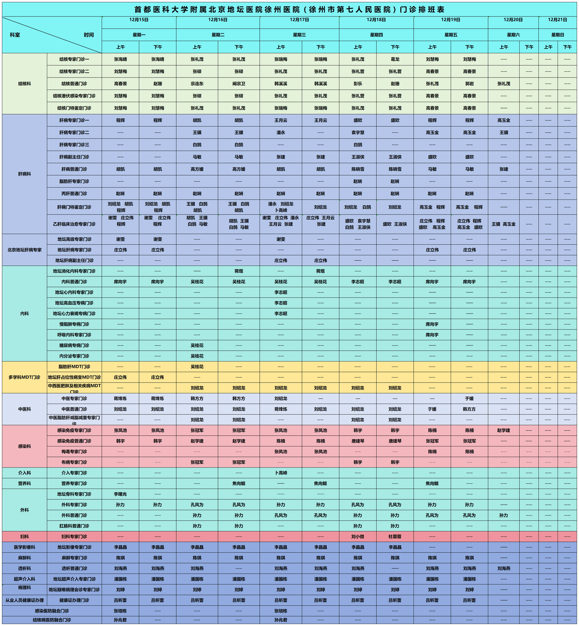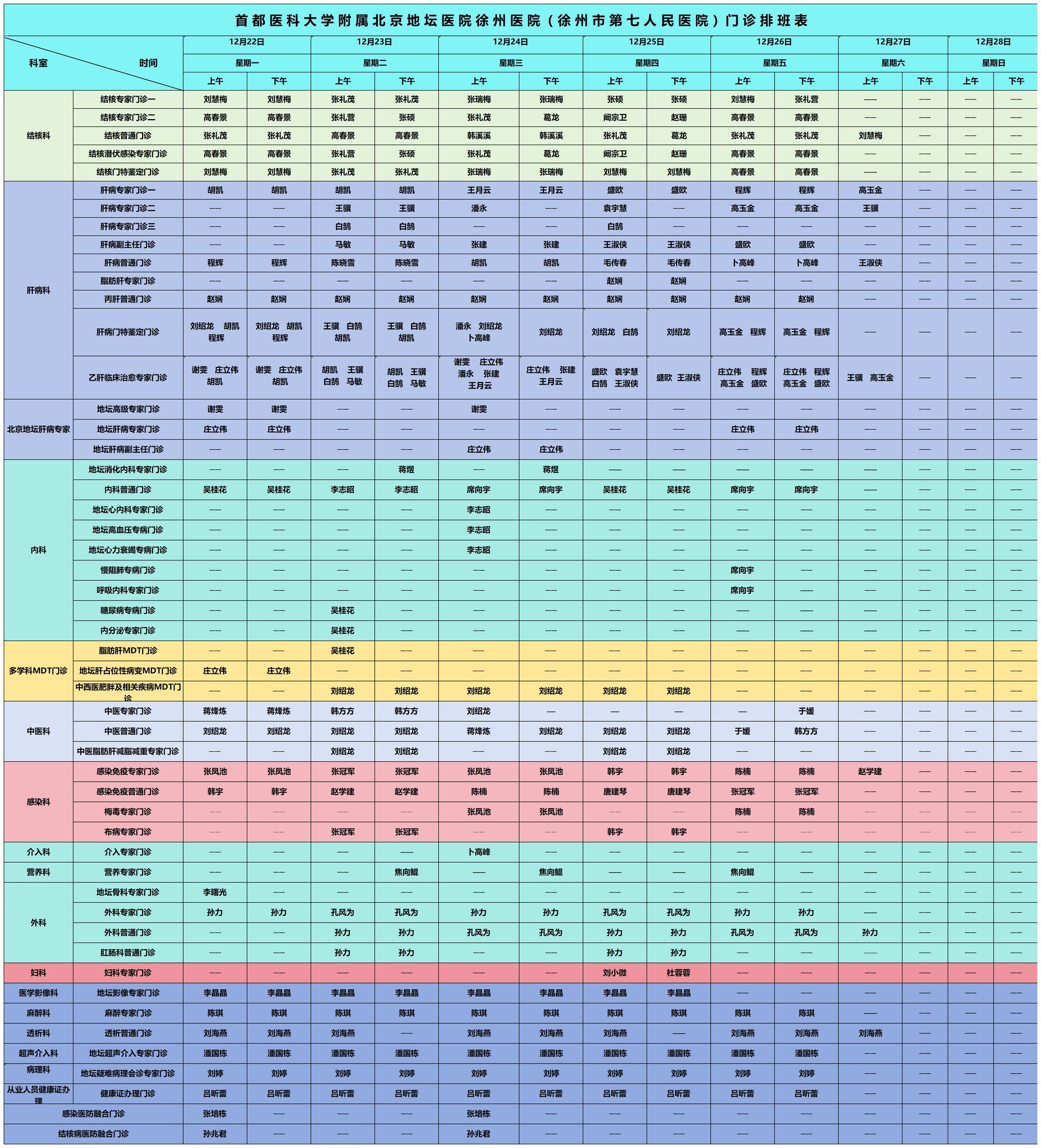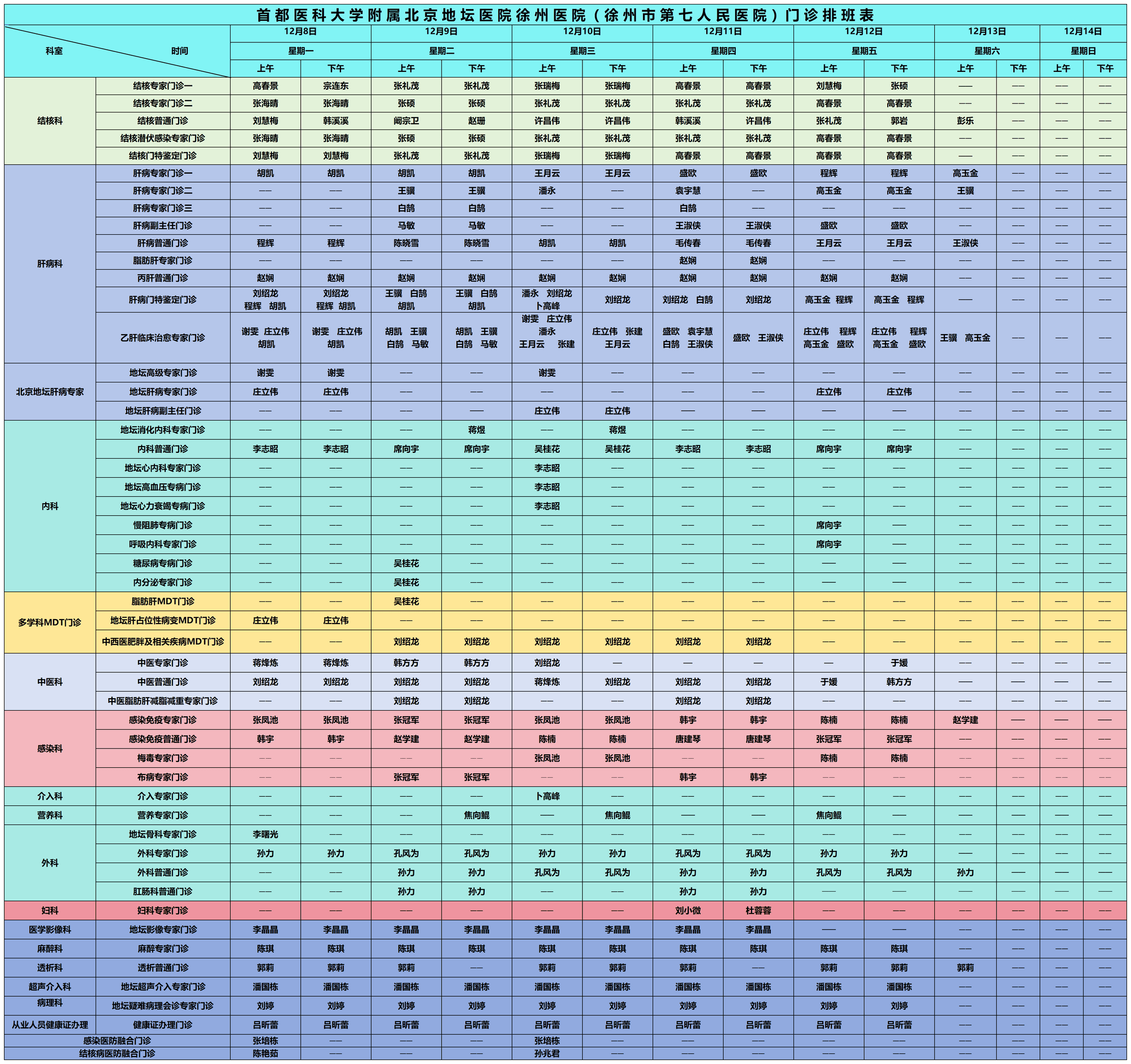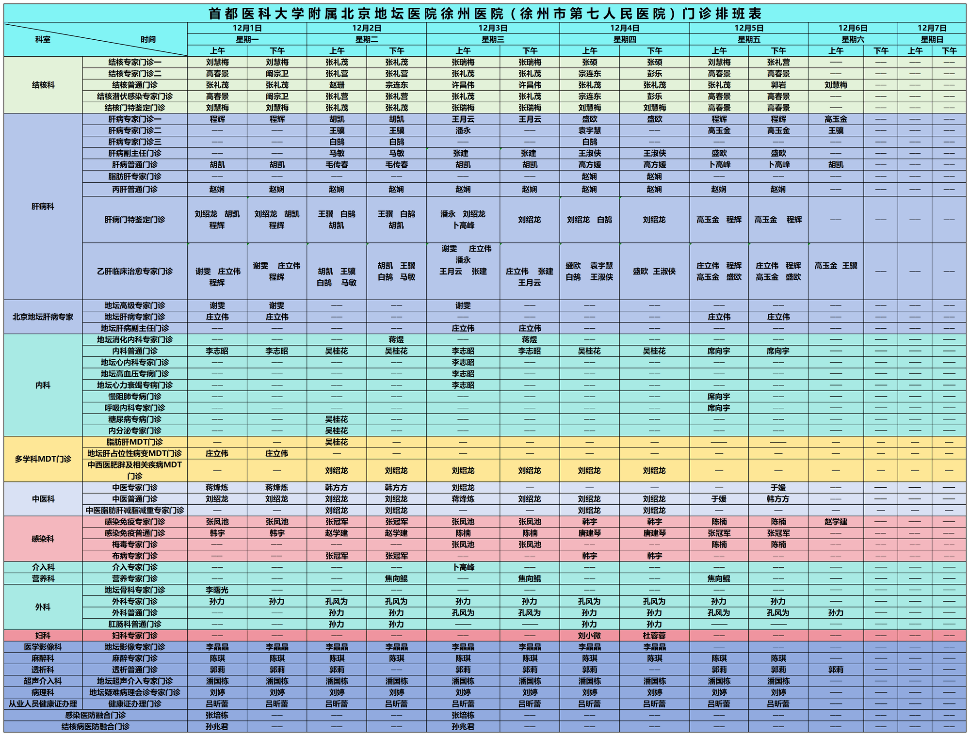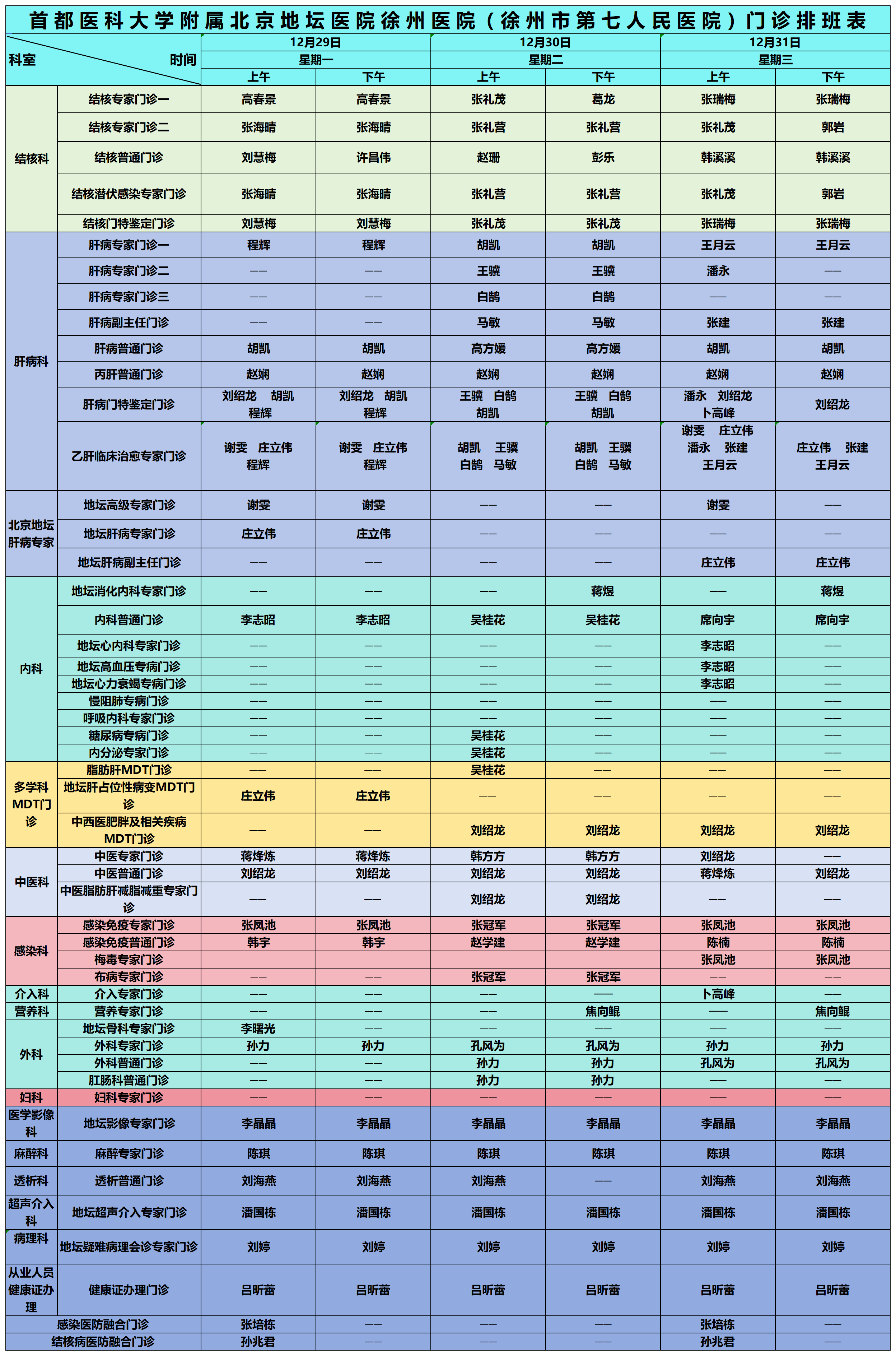 徐州市第七人民医院门诊坐诊信息一览表(12月1日-12月31日)