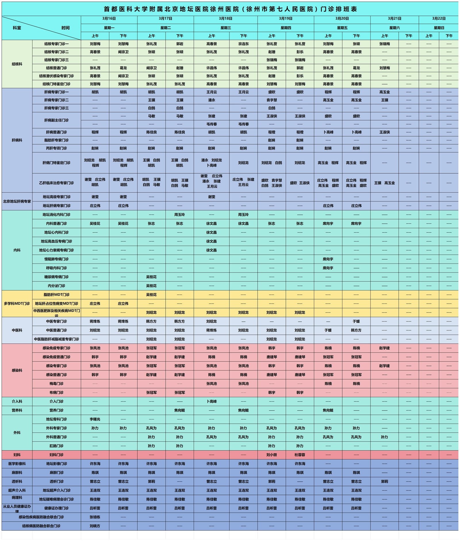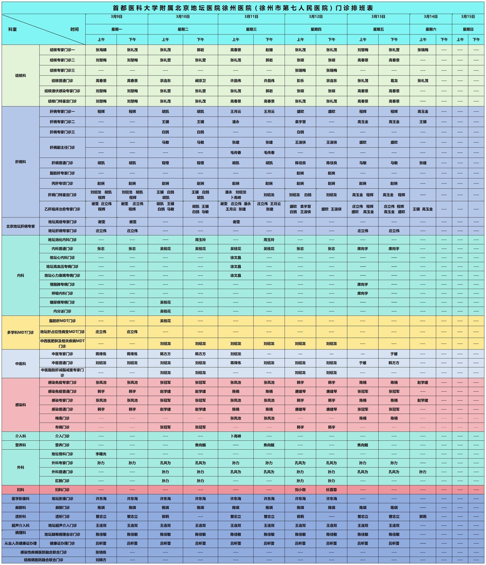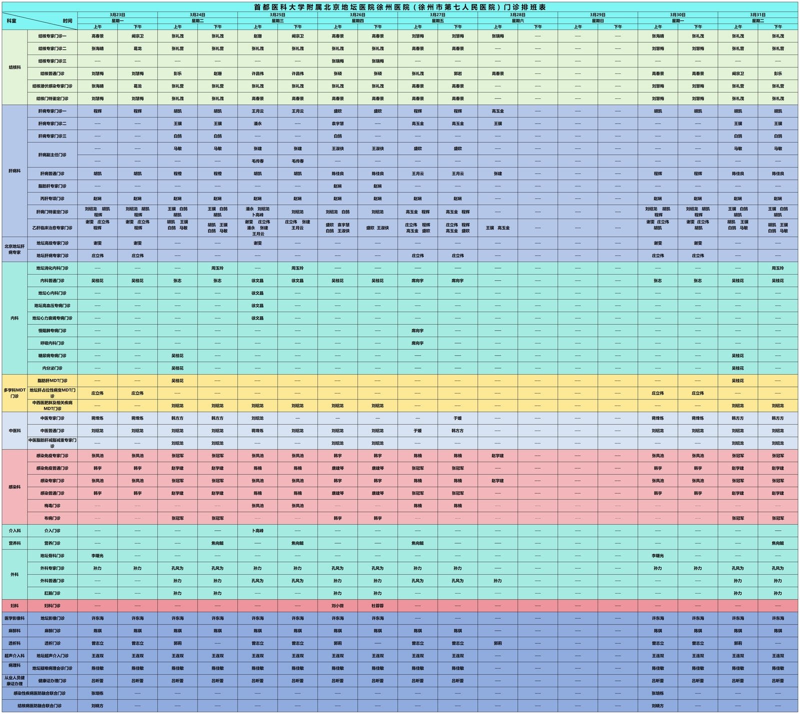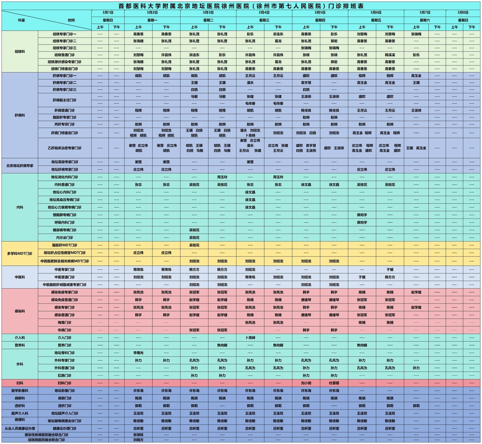 徐州市第七人民医院门诊坐诊信息一览表(3月1日-3月31日)